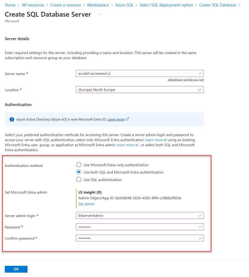 - If you want to setup a new SQL server in Azure and you want to use that server for both Ecodel data warehouse and the Analytics database you must select Authentication method - Use both SQL and Microsoft Entra authentication and then you must set a Microsoft Entra admin on the server (single user or group) and you also need to create a Server admin login and password. You need to do this because Ecodel database uses SQL login but Analytics uses managed identity and therefor you need Microsoft Entra authentication as well.
