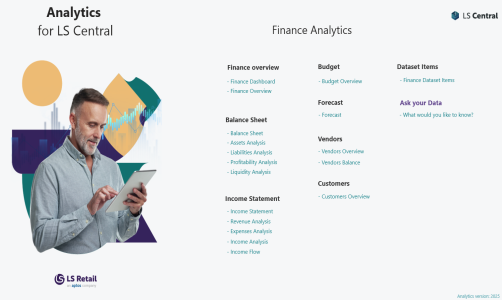 Analytics for LS Central offers Sales, Inventory, Supply chain, and Actionable Insights Power BI report templates out of the box for all LS Central instances and an additional Hotels report template for those that have the LS Central for Hotels extension.