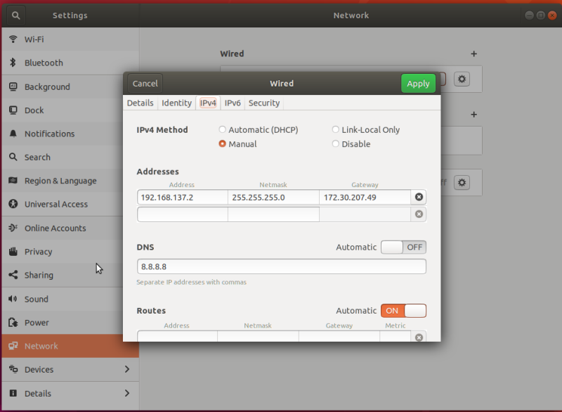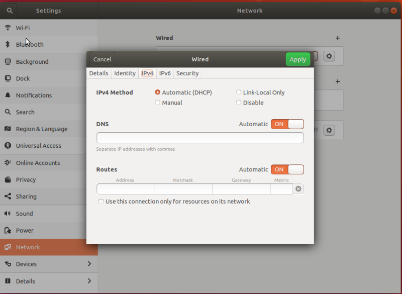 - Navigate to the IPv4 tab, and select the Manual option in the IPv4 Method section: