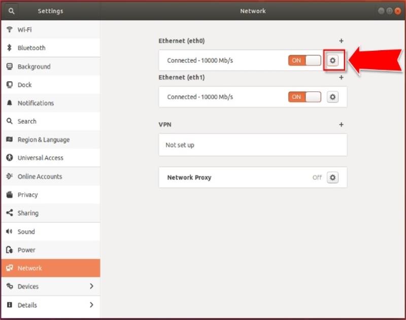 - Click the Settings icon in the wired section (in the Ethernet (eth 0) field):