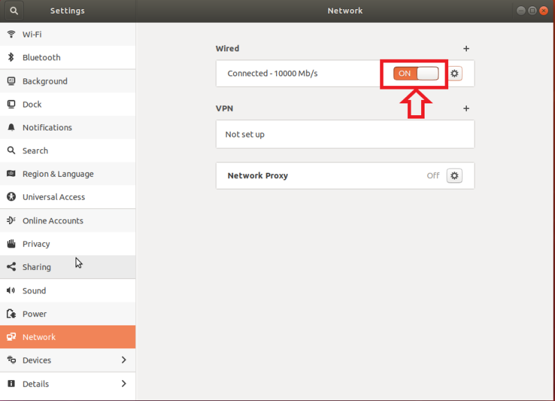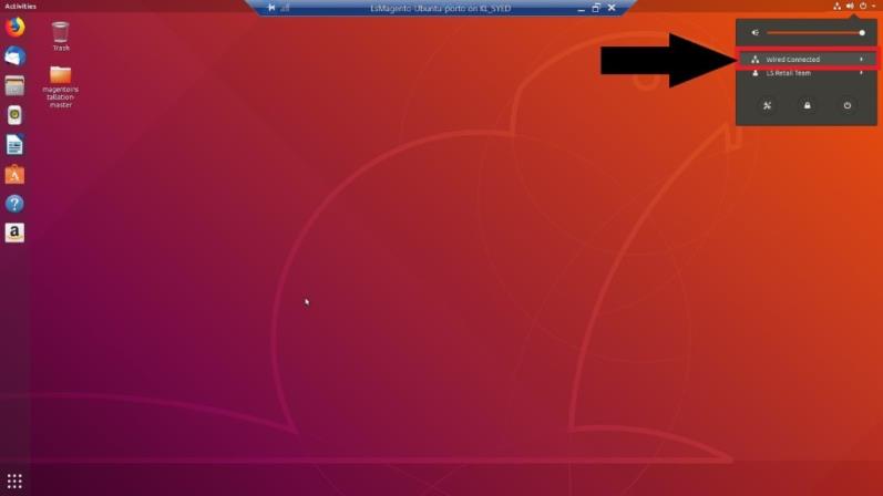 - From your Ubuntu VM, click the drop-down icon in the top-right corner of the display, and navigate to the wired setting: