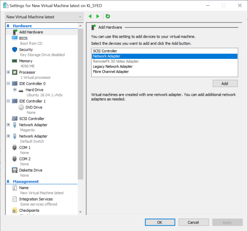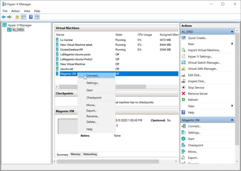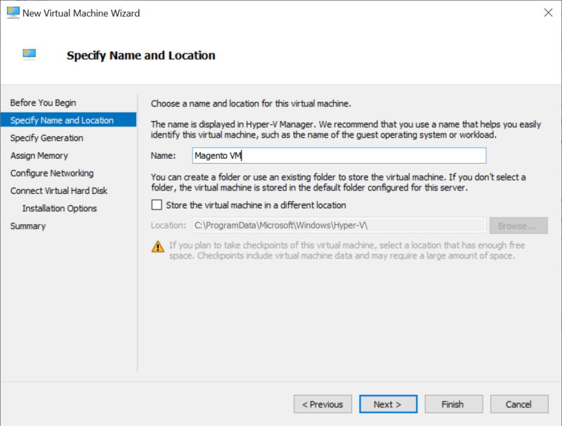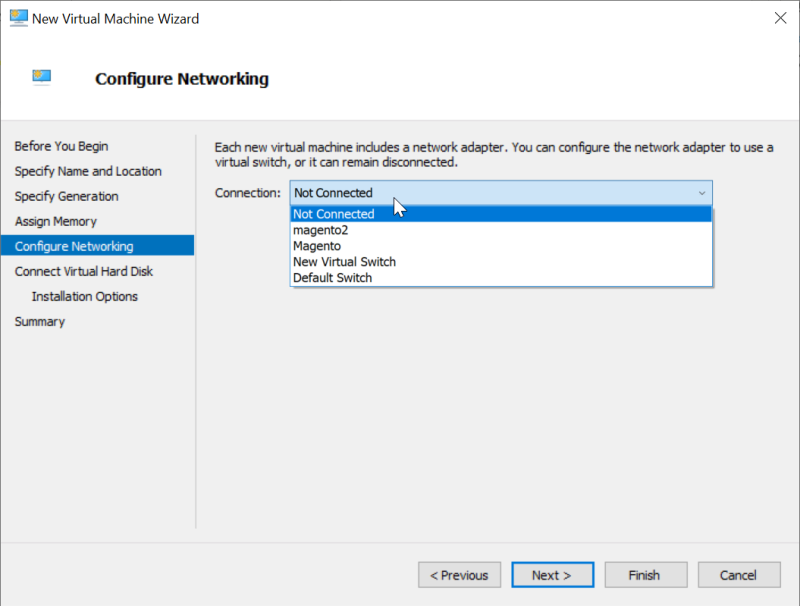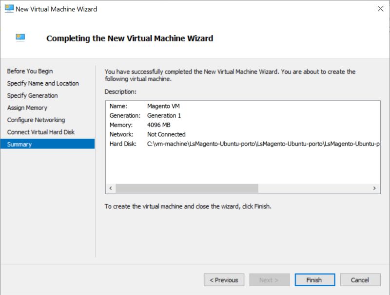 - Click Next, and then Finish on the following screen. You will see a newly created VM in your Hyper-V window.