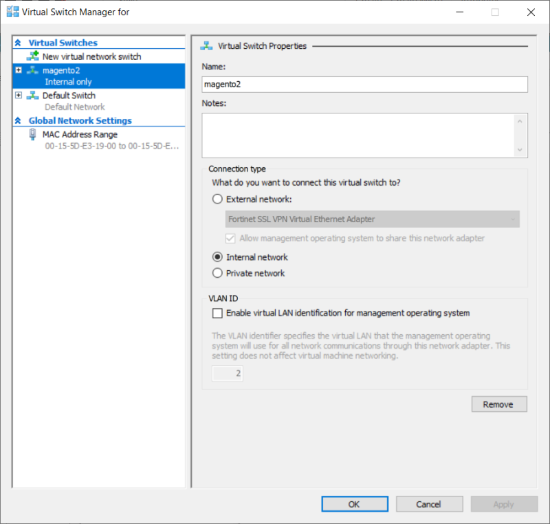 - Create a Virtual Switch Manager with any name, for example “magento2”, with the below configuration: