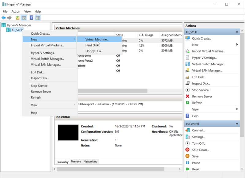 - Open the Hyper-V Manager, right-click the left navigation bar, and select New - Virtual Machine: