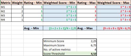 The below table shows an example of how the Score Threshold is calculated when four metrics are activated.