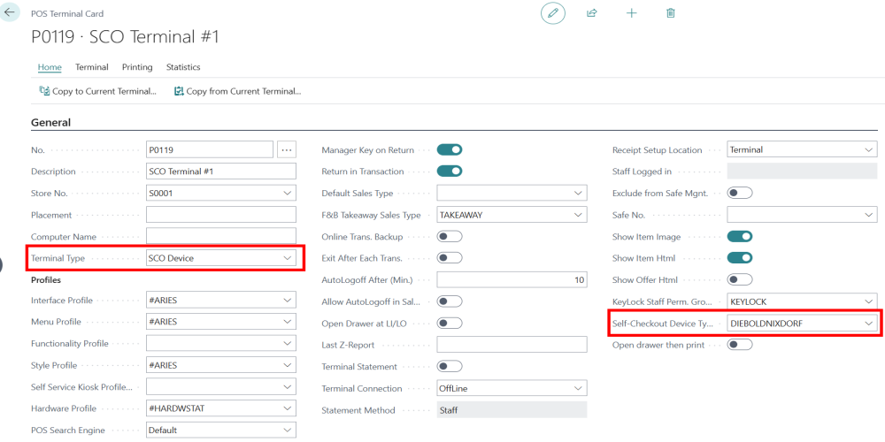 On the POS Terminal card, assign a Self-Checkout Device Type and set Terminal Type to SCO Device.