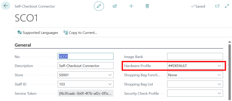SCO first uses the Hardware Profile defined on the Self-Checkout Connector page. If none is defined there, it uses the Hardware Profile from the POS Terminal. If none is found there either, it falls back to the Hardware Profile defined on the Store.