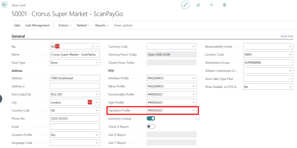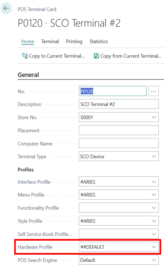A Hardware Profile defines which hardware devices (such as EFT terminals, printers, scanners, and scales) are connected to the POS environment. SCO uses this profile to know which devices it should communicate with through Hardware Station.