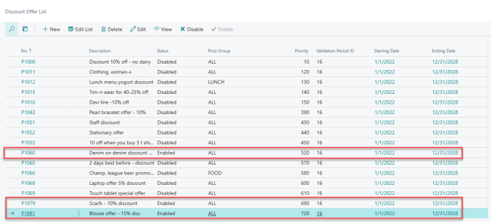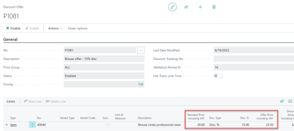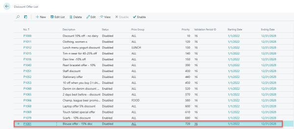 In LS Central, open the Discount Offer List page and disable the selected discount (for example, P1081: Blouse offer - 15% disc).