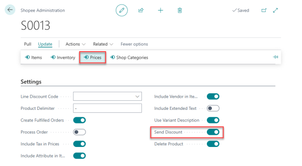 - Go to the Shopee Administration page. Under Settings, enable the option Send Discount.After confirming the setting, navigate to Update - Prices to send the prices and discounts to Shopee.