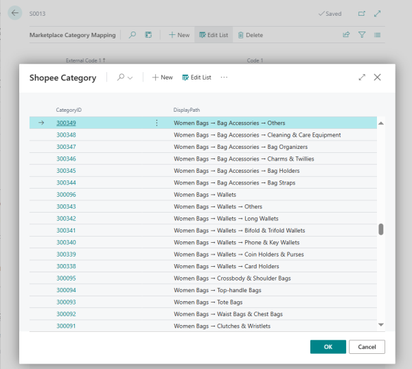 - Open the Shopify Administration page, go to Related - Mapping - Marketplace Category, and on the mapping page select the appropriate Category ID and code for the product you want to send to Shopee (for example, “40210 - Black dice flow watch Davi-s”); refer to the screenshot for details.