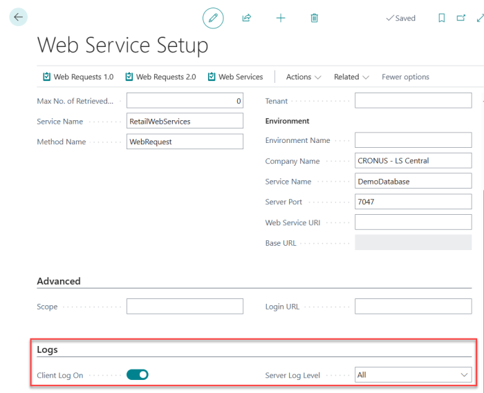 - In the Web Service Setup page, enable the option Client Log On and select All from drop-down menu.