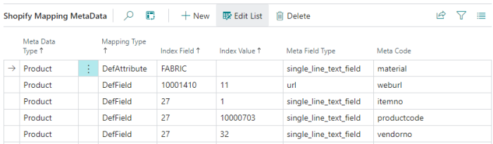 Sets up Mapping of a field in LS Central tables to Shopify Meta Data entry. Fields from Item and Customer tables can be used and all fields in related tables to those (with relationship mapping to Item or Customer).
