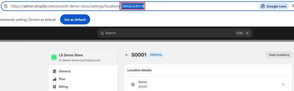 Maps Shopify Locations to LS Central Stores. This is used for Click and Collect orders to route orders to the correct Store in LS Central or to route Smart order routing orders to the correct Store. It is also used to include extra Inventory status for other locations than the default Web Store location. The Shopify location ID can be found at end of the browser URL when you open the location in Shopify setting.