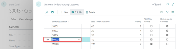 - In the LS Commerce FastTab in the Store Card, enable the Calculate Inventory for Sourcing Locations check box. First, confirm that the Warehouse (W0001) location for the Web Store exists; if it does not, create a new entry in the Customer Order Sourcing Locations table.