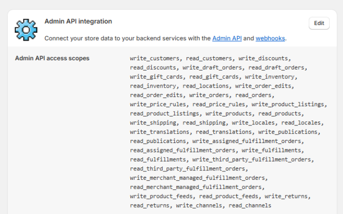 - Add a Custom app, and in its configuration give access to those API access scopes seen in the image below. Pick (Latest) Webhook version. This version information along with the shop name is needed to make up the URL that LS Central uses when it communicates with Shopify.