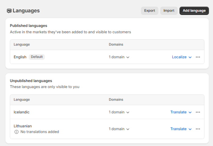 Before enabling language synchronization between LS Central and Shopify, the necessary languages must first be configured in your Shopify store. This step ensures that LS Central can retrieve the available locale codes and send translated content correctly to Shopify.