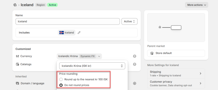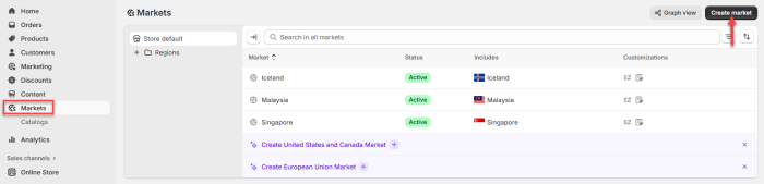 To configure markets and catalogs in Shopify: